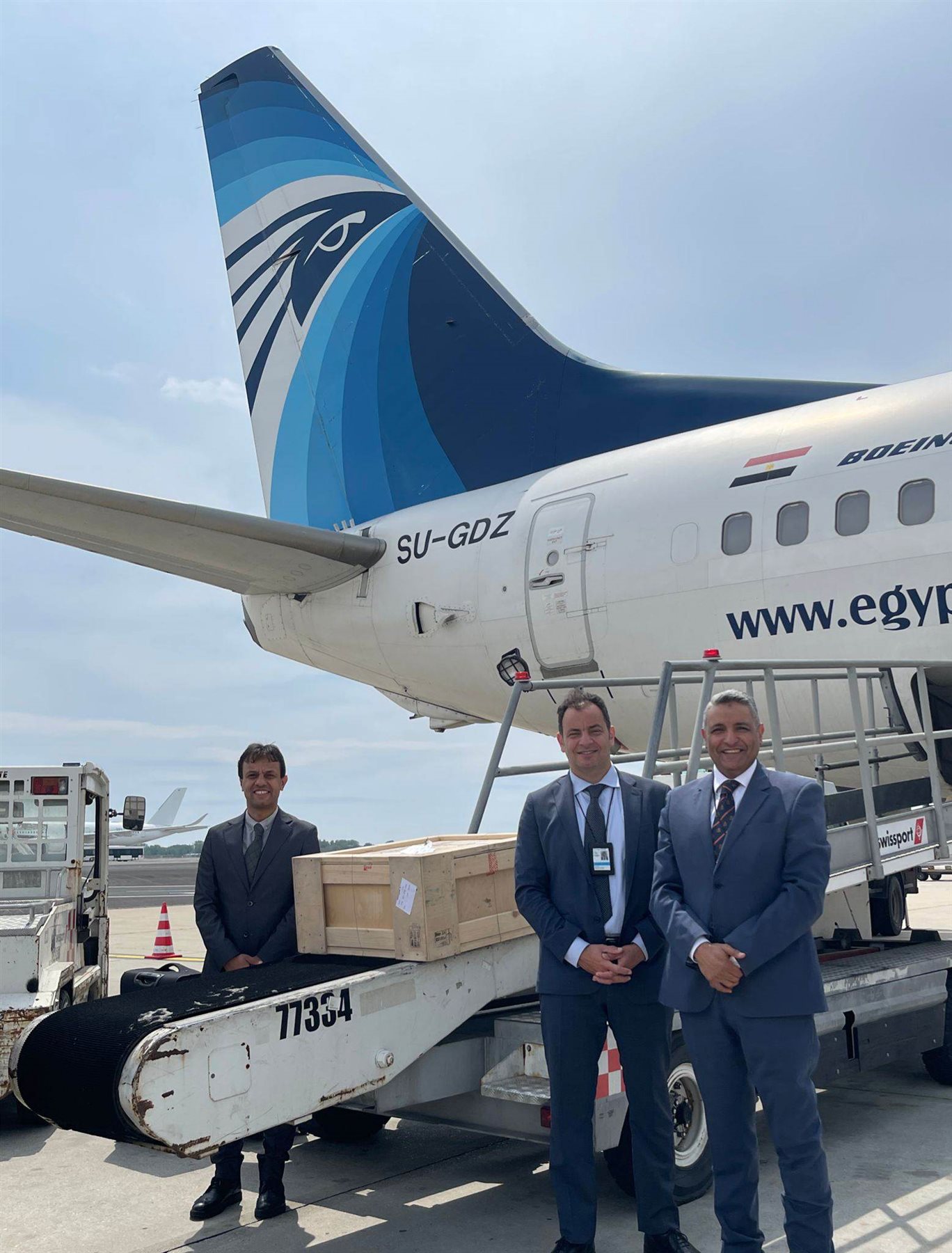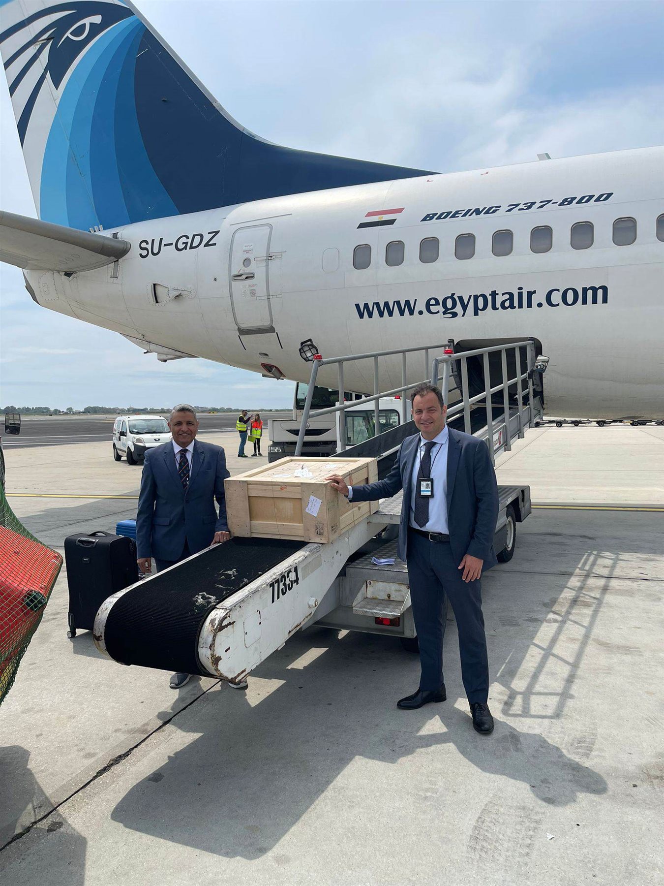و صرح المهندس يحيى زكريا، رئيس مجلس إدارة الشركة القابضة لمصر للطيران، أن الشركة تقوم بدورها القومى فى استرداد باقى القطع المصرية الأثرية المهربة من مختلف دول العالم، بالتنسيق مع وزارة السياحة والآثار ووزارة الخارجية المصرية، وتم تقديم التسهيلات اللازمة كافة بالتعاون بين السلطات الإيطالية والسفارة المصرية بروما من خلال السفير باسم راضى، سفير مصر بروما، وناجى غابة، نائب السفير المصرى، وحاتم محمود، مدير مكتب مصر للطيران بروما، لنقل شحنة الآثار على متن طائرة مصر للطيران من طراز B737-800 مع توفير وسائل التخزين والحماية كافة لضمان وصول الشحنة بأمان إلى أرض الوطن.