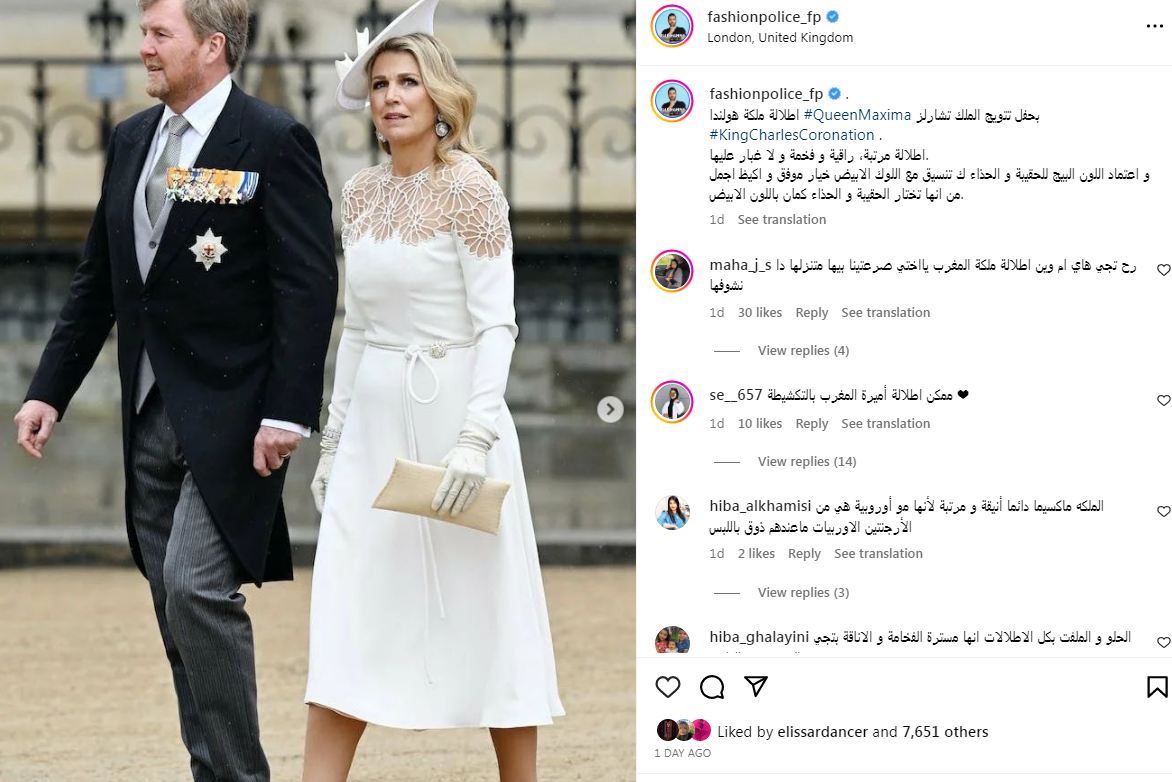 حرص ناقد الموضة اللبناني إيلي حنا على إبداء رأيه بأحدث إطلالات ملكة هولندا ماكسيما، عبر الصفحة الرسمية لشرطة الموضة بالإنستجرام، قائلًا: "إطلالة ملكة هولندا بحفل تتويج الملك تشارلز الثالث، اطلالة مرتبة، راقية و فخمة و لا غبار عليها".