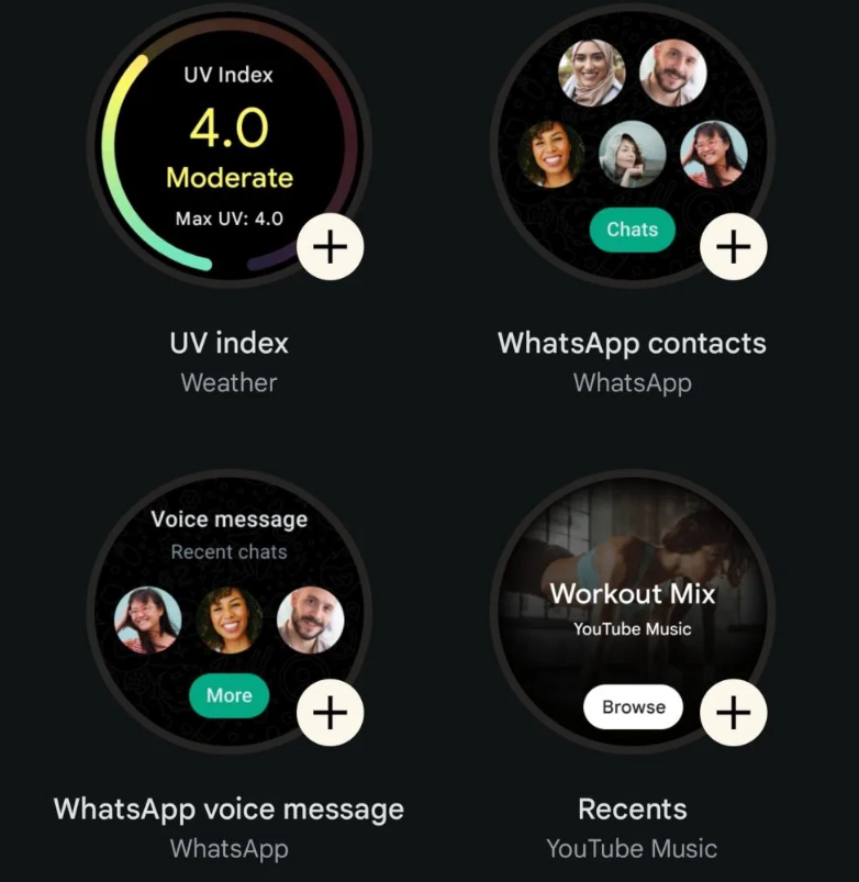 يقدم WhatsApp تعقيدًا دائريًا يعرض رسائل غير مقروءة على الصفحة الرئيسة لساعتك. يوجد أيضًا مربعان لجهات الاتصال والرسائل الصوتية، للسماح لك بالوصول السريع إلى الأشخاص أو بدء تسجيل الرسائل الصوتية.