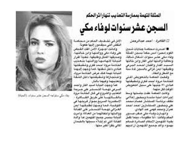 وتعود واقعة سجن وفاء مكي لمدة 10 سنوات بتهمة تعذيب خادمتين، إلى عام 2001 أي قبل 22 عاماً، حيث تم اتهامها ووالدتها بتعذيب خادمتين وهتك عرضهما، واستطاعت حينها الهروب لمدة أسبوعين، لكن سرعان ما تمكنت الشرطة من إلقاء القبض عليها، وحُكم عليها بالحبس لمدة 10 سنوات مع الشغل والنفاذ، فيما حكم على والدتها بعام واحد.