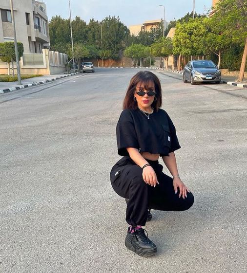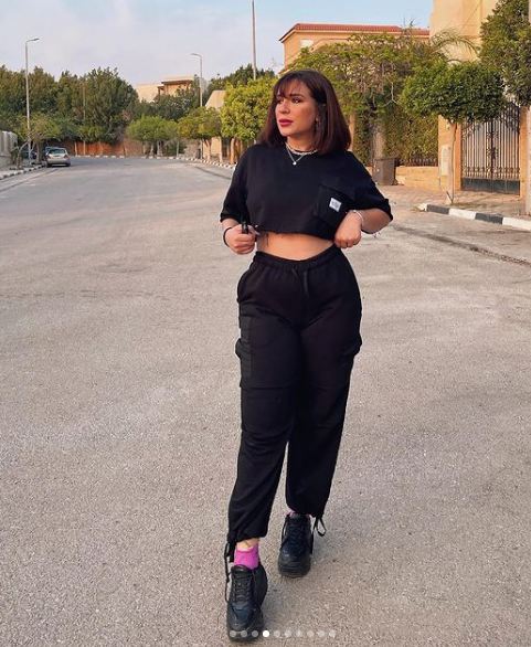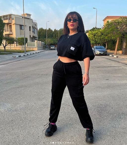 ظهرت أسماء شريف منير بإطلالة جذابة أنيقة، مرتدية بدلة رياضية تتكون من بنطال وتوب باللون "الأسود"، تكشف منطقة البطن، مصمم من قماش بدون نقاشات، أكملت اللوك بنظارة شمسية وحذاء أسود، مما أبرز جمالها وقوامها الممشوق.