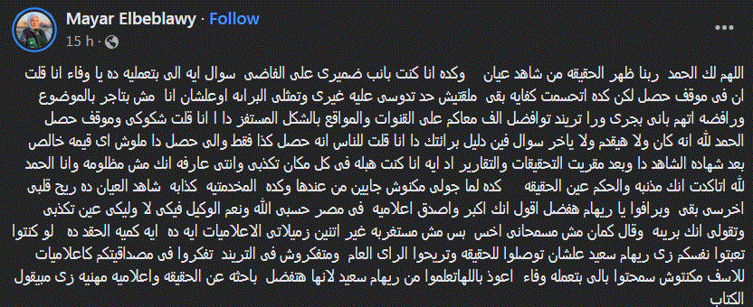 وفاجأت الفنانة المعتزلة ميار الببلاوي جمهورها بالتراجع عن تصريحاتها الأخيرة بشأن براءة وفاء مكي في قضية تعذيب الخادمتين، وذلك من خلال منشور عبر حسابها الشخصي بموقع التواصل الاجتماعي الأشهر "فيس بوك".