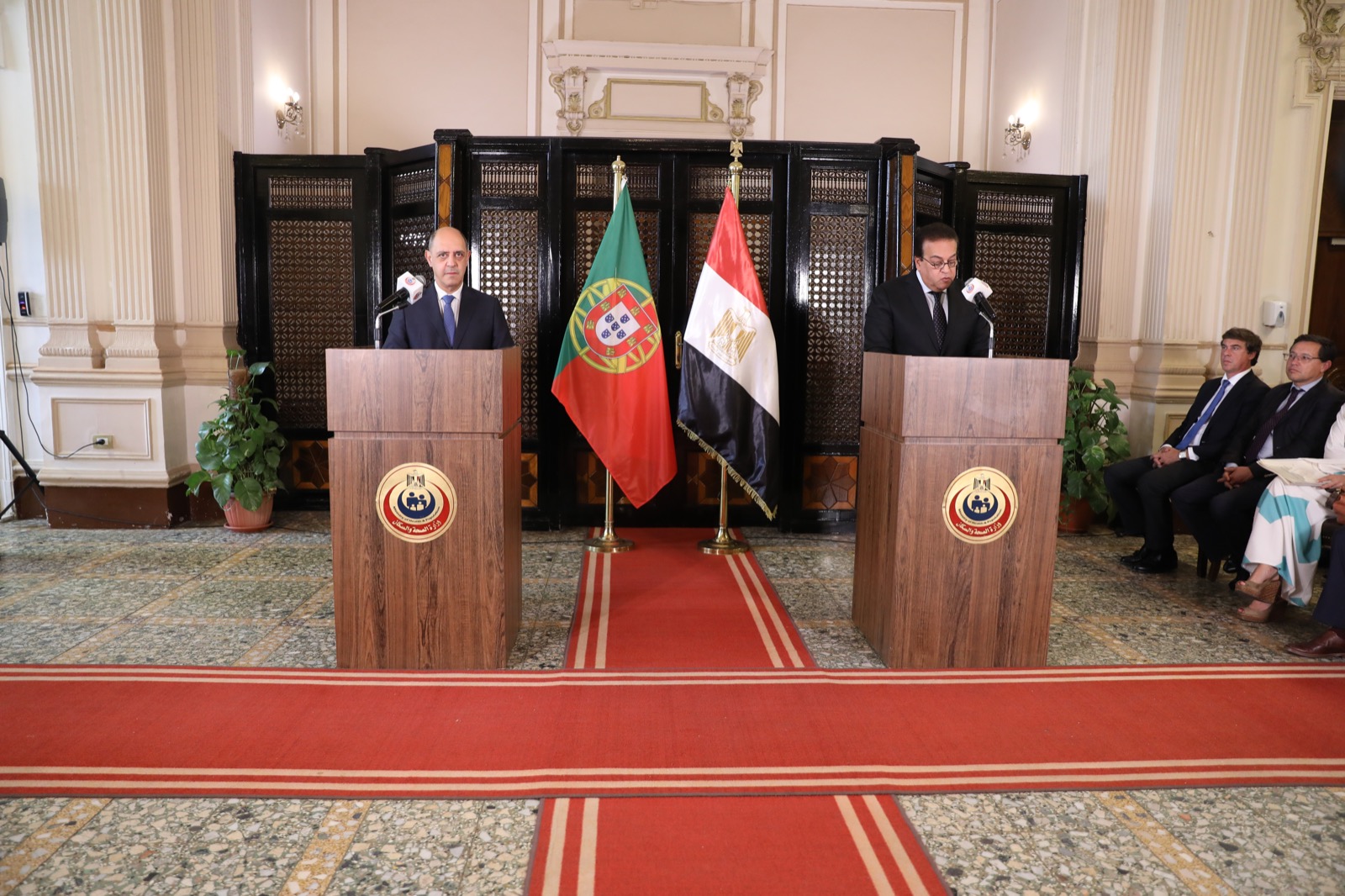 وقع الدكتور خالد عبدالغفار وزير الصحة والسكان، ونظيره البرتغالي مانويل بيزارو، وزير الصحة البرتغاليي، مساء الثلاثاء، بروتوكول تعاون بين البلدين لتعزيز قدرات القطاع الصحي والدوائي.