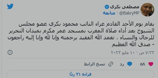 وكتب الكاتب الصحفي والنائب بالبرلمان مصطفى بكري، عبر "تويتر،" يقام يوم الأحد المقبل عزاء النائب محمود بكري عضو مجلس الشيوخ، بعد أداء صلاة المغرب بمسجد عمر مكرم بميدان التحرير للرجال والنساء، تغمد الله الفقيد برحمته وإنا لله وإنا إليه راجعون.