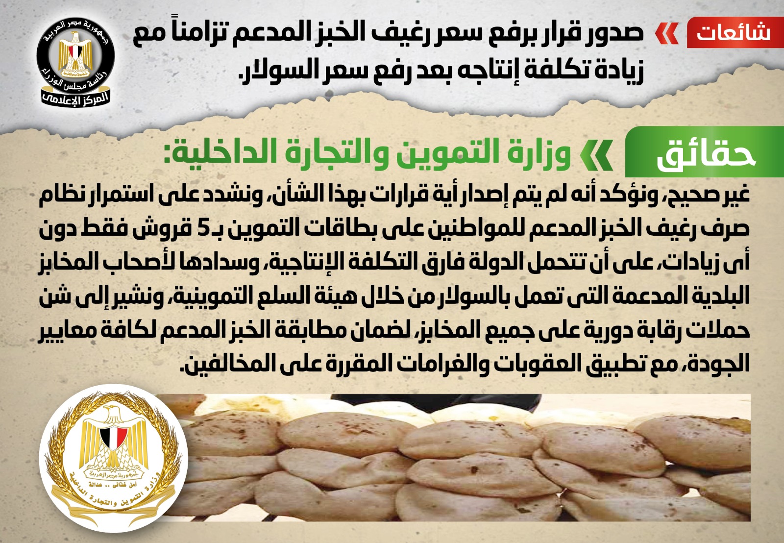 وقد قام المركز الإعلامي لمجلس الوزراء بالتواصل مع وزارة التموين والتجارة الداخلية، والتي نفت تلك الأنباء، مُؤكدةً أنه لا صحة لرفع سعر رغيف الخبز المدعم تزامناً مع زيادة تكلفة إنتاجه بعد رفع سعر السولار، وأنه لم يتم إصدار أية قرارات بهذا الشأن، مُشددةً على استمرار نظام صرف رغيف الخبز المدعم للمواطنين على بطاقات التموين بـ 5 قروش فقط دون أي زيادات، على أن تتحمل الدولة فارق التكلفة الإنتاجية، وسدادها لأصحاب المخابز البلدية المدعمة التي تعمل بالسولار من خلال هيئة السلع التموينية، مُشيرةً إلى شن حملات رقابة دورية على جميع المخابز، لضمان مطابقة الخبز المدعم لمعايير الجودة، مع تطبيق العقوبات والغرامات المقررة على المخالفين.