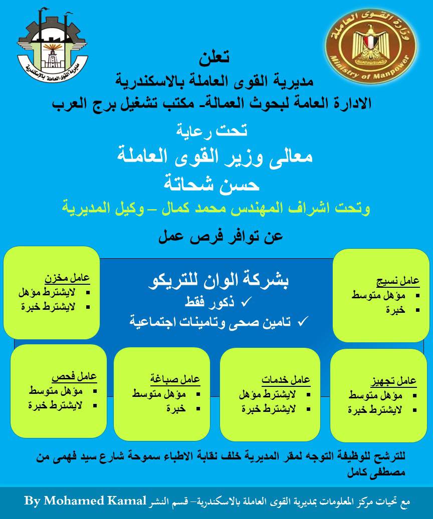 أعلنت مديرية القوى العاملة بمحافظة الأسكندرية عن توفير 27  فرصة عمل للشباب علي مهن: عامل نسيج ، عامل تجهيز ، عامل خدمات ، عامل صباغة  ، عامل فحص ، عامل مخازن، وذلك للعمل في شركة "ألوان للتريكو " من حديثى التخرج ، من حملة المؤهلات المتوسطة وبدون مؤهل ، مع توفير تأمين إجتماعى وصحى ، مع رواتب مجزية ، وذلك تنفيذاً لتوجيهات وزير القوى العاملة حسن شحاتة بالاهتمام بالشباب من الجنسين وتوفير فرص عمل لائقة لهم وتأهيلهم لسوق العمل .