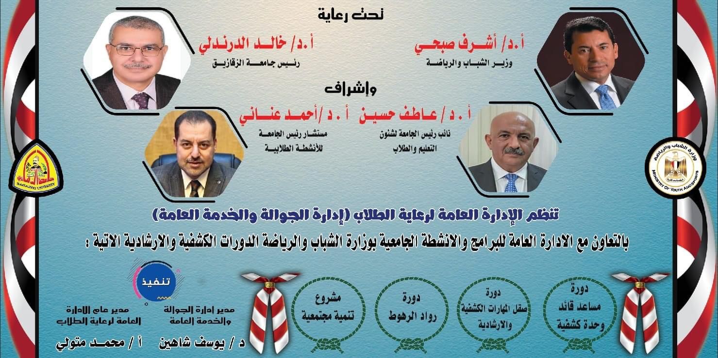أطلقت وزارة الشباب والرياضة من خلال الإدارة المركزية لتنمية الشباب - الإدارة العامة للبرامج والأنشطة الجامعية، فعاليات الدراسة الأولية لجوالات جامعة الزقازيق، بإشراف إدارة الجوالة والخدمة العامة بجامعة بنها، والتي يتم تنفيذها خلال الفترة من ٩- ١١ من الشهر الجاري، بمقر المخيم الكشفي الدائم بجامعة الزقازيق.