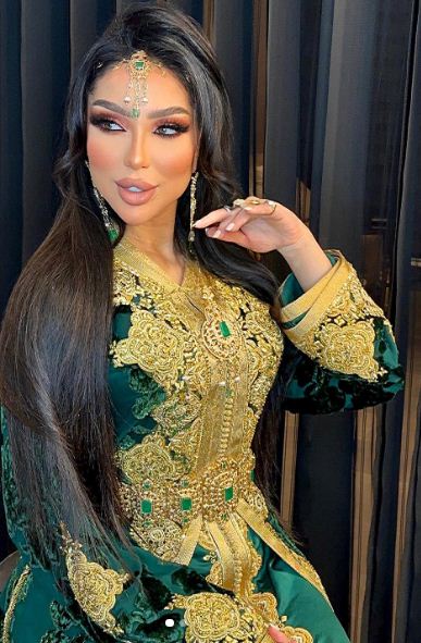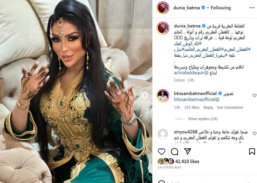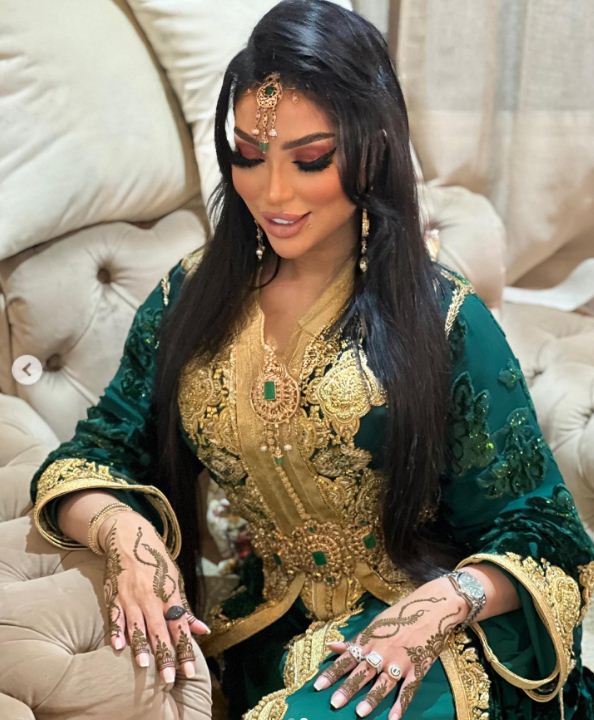 وظهرت دنيا بطمه بإطلالة مغربية فخمة مفعمة بالاحتشام والأناقة، حيث ارتدت القفطان المغربي المصمم من قماش الحرير الناعم باللون الأخضر المزركش بالشرائط الذهبية من الأمام وحول الخصر.