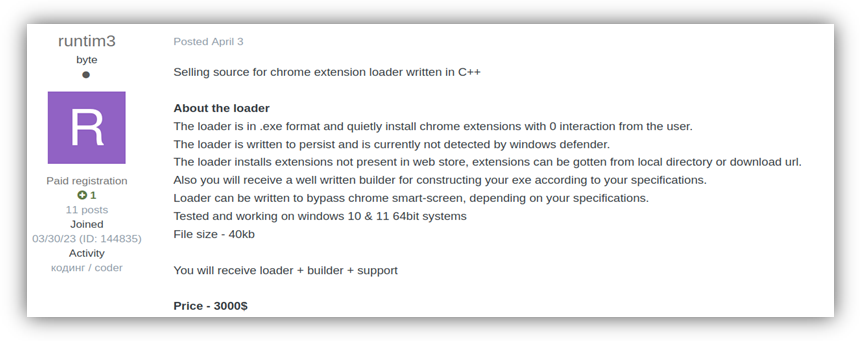 منشور يعرض إضافة متصفح خبيث للبيع على الشبكة المظلمة