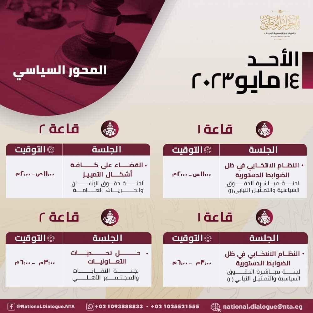 تنطلق غدًا الأحد ١٤ مايو ٢٠٢٣ أولى جلسات الحوار الوطني النقاشية حول المحور السياسي، حيث تتم مناقشة بعض القضايا التي تهم المواطنين، وذلك بمركز القاهرة للمؤتمرات بمدينة نصر.