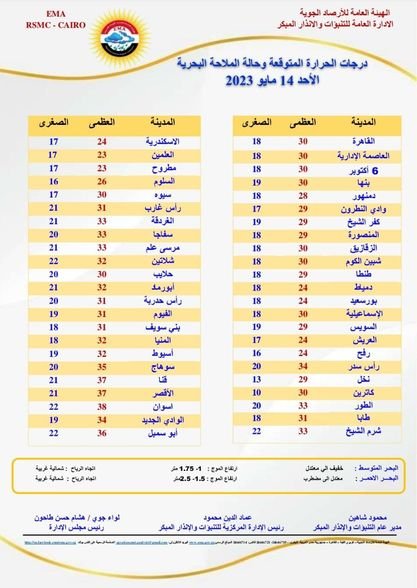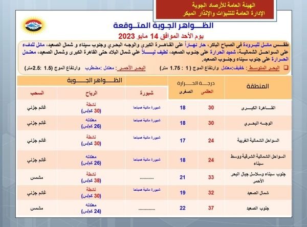 وعن درجات الحرارة المتوقعة اليوم الأحد 14-5-2023، في مدن ومحافظات الجمهورية، جاءت كالتالي: