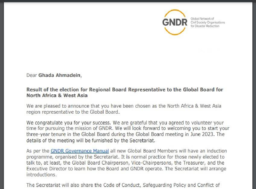 وتلقت مدير برامج شبكة "رائد" رسالة مشتركة من كل من المدير التنفيذي للشبكة العالمية لمنظمات المجتمع المدني للحد من مخاطر الكوارث، الأرجنتيني ماركوس كونسبسيون رابا، والأوروجوانية جراسيلا سالابيري، رئيس المجلس العالمي، والفلبينية زينايدا ويليسون، رئيس فريق عمل الحوكمة، لتهنئتها على اختيارها لتمثيل منطقة شمال أفريقيا وغرب آسيا (NAWA) في المجلس العالمي للشبكة.