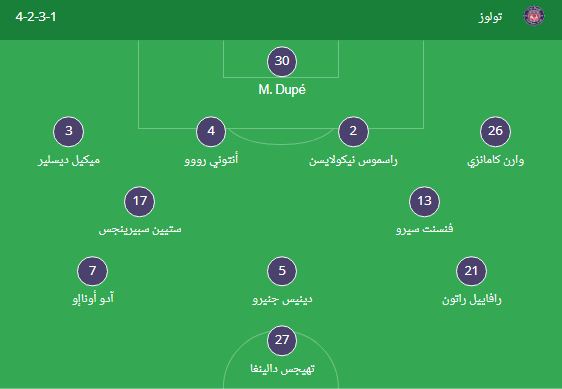 في سياق متصل، أعلن الجهاز الفني لتولوز عن تشكيل فريقه أمام نانت، والذي جاء كالتالي: