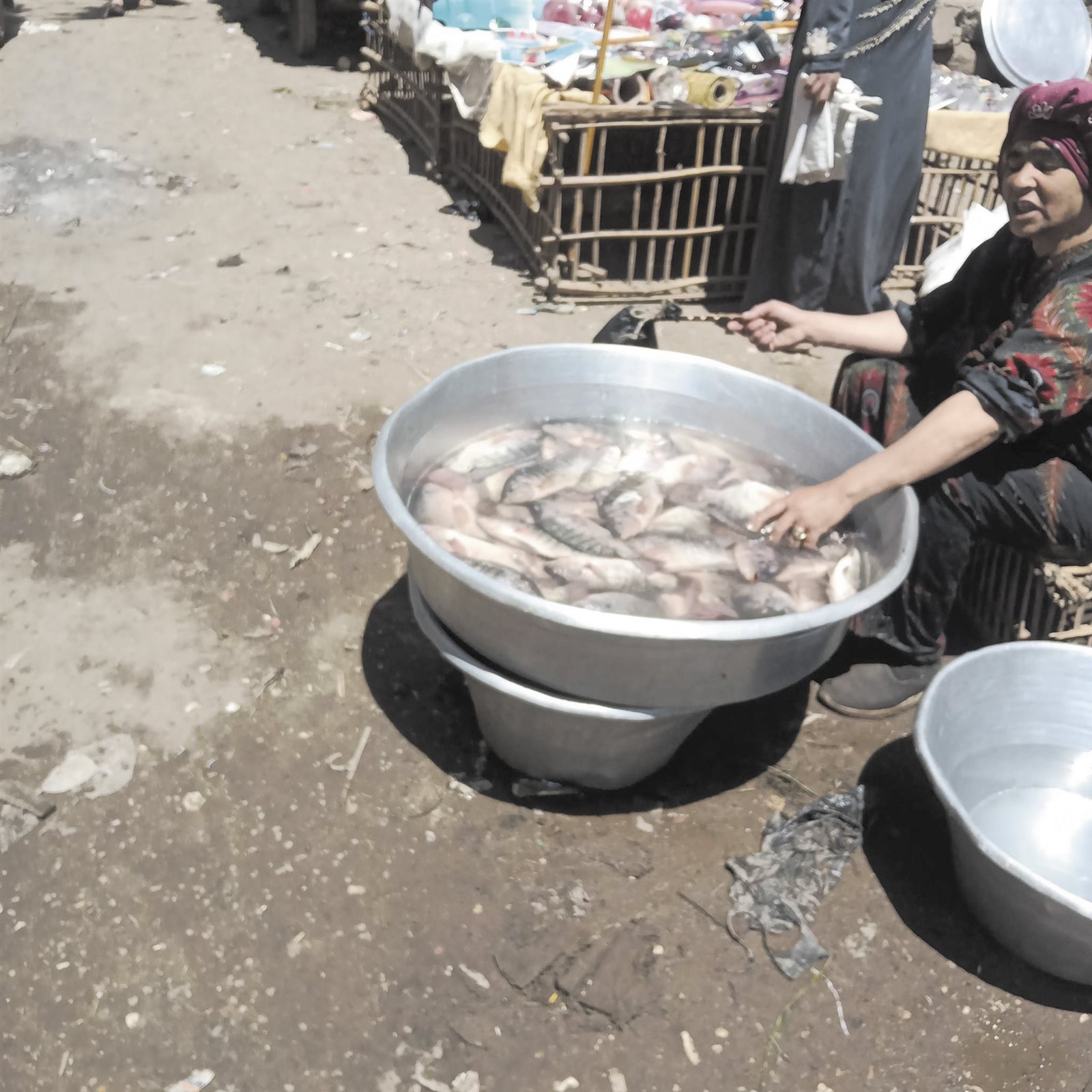 وفى آخر سوق قرية العزيزية، جنوب مركزى البدرشين، يقف بائع أربعينى رفقة نجله عشرة أعوام، على عربة «تروسيكل»، محملة بـ «طشوت» مملوءة بأسماك البلطى الطازجة، والقراميط.