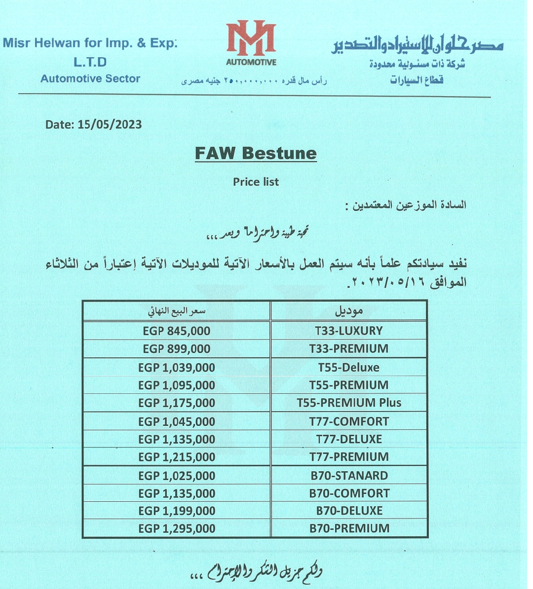 وفقاً لقائمة شركة مصر حلوان الجديدة، فإن أسعار سيارات بيستيون "B70 ، وt77، وt33، وt55" شهدت زيادات بدايةً من اليوم.