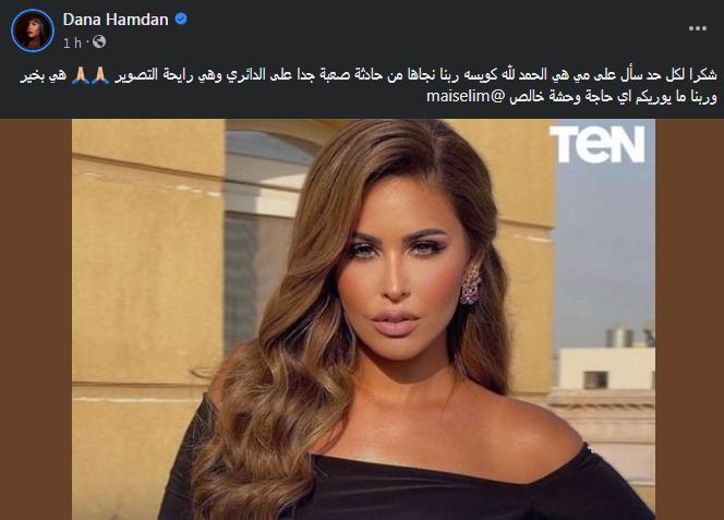 وفي السياق ذاته، طمأنت دانا حمدان الجمهور على صحة شقيقتها مي سليم من خلال منشور عبر حسابها الشخصي بموقع التواصل الإجتماعي الأشهر "فيس بوك"، حيث نشرت صورتها وعلقت: "شكرًا لكل حد سأل على مي هي الحمد لله كويسه ربنا نجاها من حادثة صعبة جدا على الدائري وهي رايحة التصوير، هي بخير وربنا ما يوريكم اي حاجة وحشة خالص".