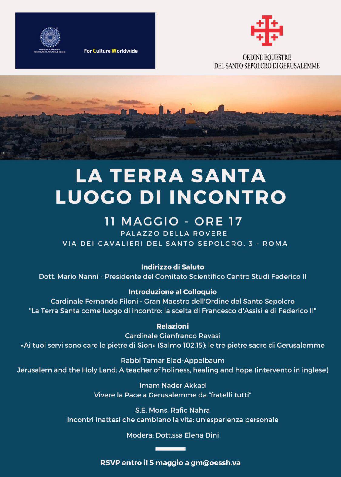 انعقد مؤتمر "الأرض المقدسة مكان لقاء الأديان" الذي نظمه مركز دراسات فيديريكو الثاني في قصر ديلا روفيري ، وحضر المؤتمر ممثلين عن الديانات الثلاث للكتاب لمناقشة السلام والأخوة بين الأديان وهم الإمام نادر العقاد من الجامع الكبير في روما، والكاردينال جيانفرانكو رافاسي المحافظ الفخري لمديرية الثقافة والتعليم، والحاخام تامار العاد أبلباوم من القدس، والأب رفيق نهرا نائب بطريركية إسرائيل لإسرائيل، البطريركية اللاتينية في القدس.