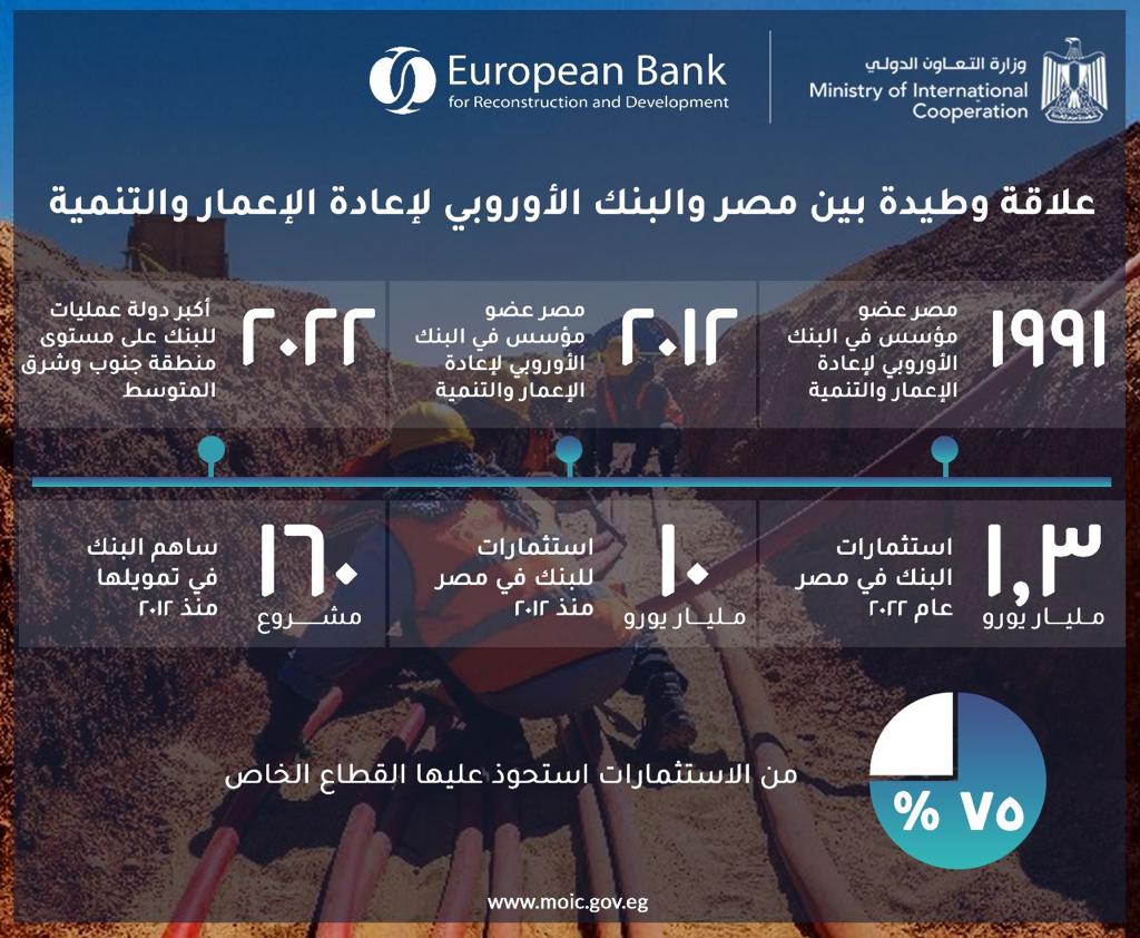 وترتبط جمهورية مصر العربية، بعلاقات تعاون إنمائي وطيدة مع البنك الأوروبي لإعادة الإعمار والتنمية، حيث تعد عضوًا مؤسسًا وأصبحت دولة عمليات كاملة لدى البنك منذ عام 2012، وهو ما عزز عمليات واستثمارات البنك في مصر للقطاعين الخاص والحكومي، لتتجاوز 10 مليارات يورو في 160 مشروعًا، نحو 75% من هذه الاستثمارات تم توجيهها للقطاع الخاص.