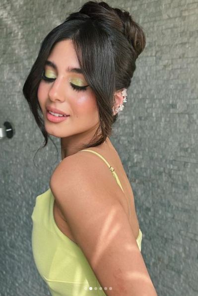 اعتمدت الفنانة مايان السيد تسريحة شعر بسيطة تتناغم مع ملامحها، إذ إنها جمعت خصلات شعرها بطريقة جذابة، ووضعت مكياجًا ناعمًا ليبرز جمالها، مرتكزًا على الألوان الترابية وتحديد عينيها بالكحل والماسكرا السوداء واللون النود في الشفاه.