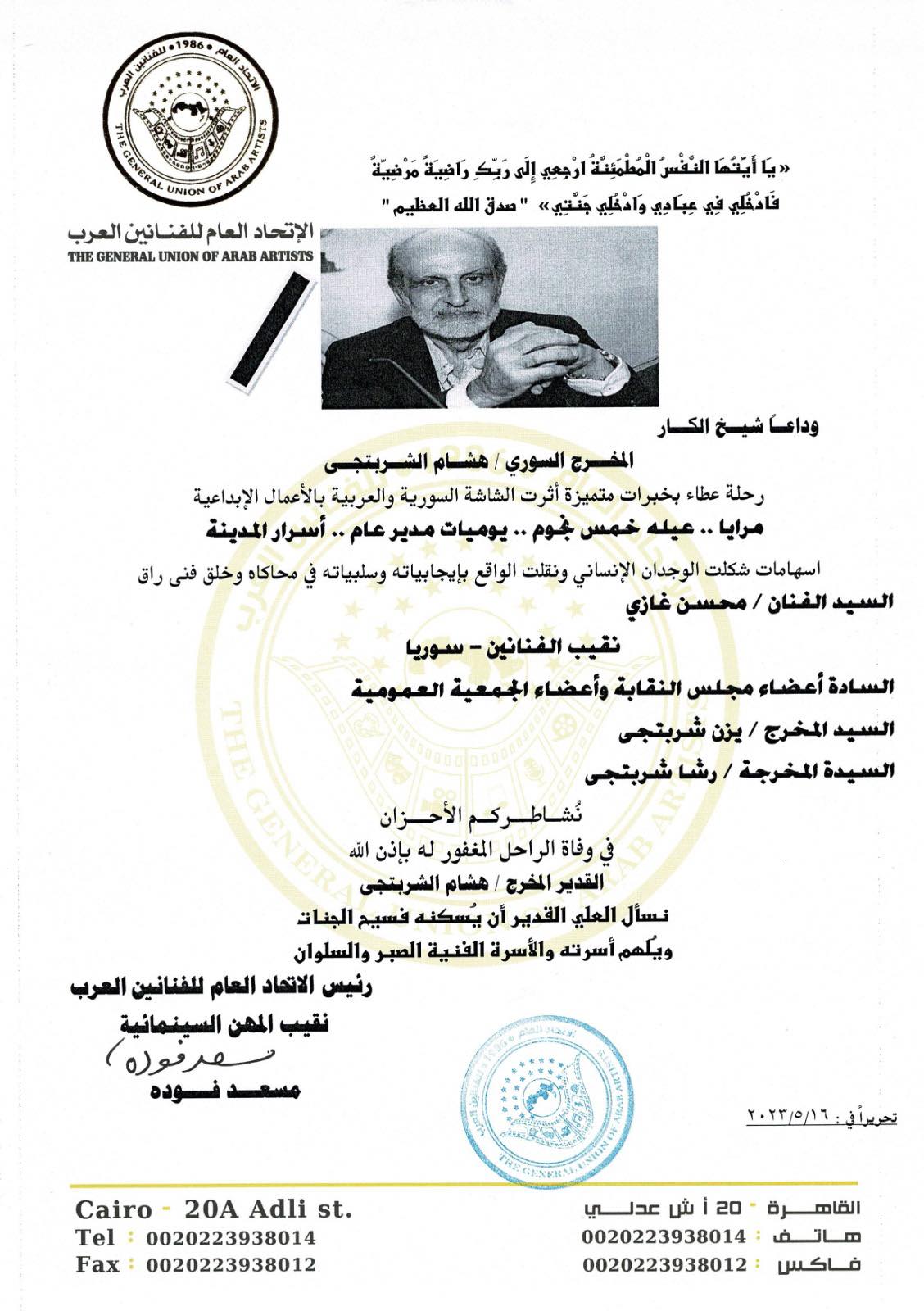 وأضاف البيان:" السيد الفنان محسن غازي، نقيب الفنانين - سوريا، نشاطركم الأحزان في وفاة المغفور له بإذن الله، القدير المخرج هشام الشربتجي، نسأل العلي القدير أن يسكنه فسيح الجنات، ويلهم اسرته والأسرة الفنية الصبر والسلوان ".