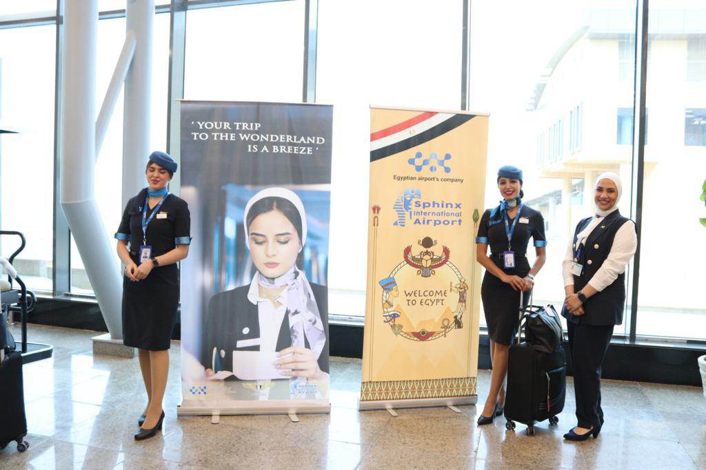 وقامت سلطات مطار سفنكس باستقبال الطائرة برش المياه  وهو الإجراء الدولي المتبع في افتتاح خطوط الطيران الجديدة أو وصول أول رحلة الي المطار،  وقام فريق من العلاقات العامة  بالمطار باستقبال الركاب بالورود والشيكولاتة ترحيباً بوصولهم إلي مصر.