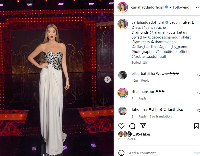 وبدت كارلا حداد بإطلالة ناعمة جذابة، حيث ارتدت فستان طويل مجسم، ينتمى لقصة ال v، صمم من قماش ناعم بنقشه التايجر من الأمام والحرير من الجزء السفلي، الفستان حمل توقيع DANY ATRACHE، وعكس قوامها الناعم وأنوثتها الجذابة.