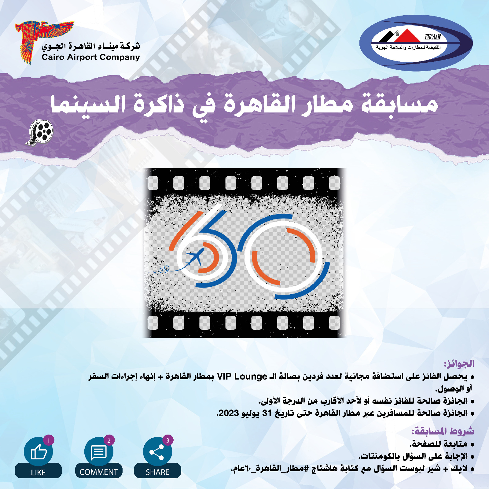 وتأتي تلك المسابقة تخليدًا للدور الثقافي الكبير لمطار القاهرة الدولي في ذاكرة السينما المصرية حيث شهد تصوير عدد كبير من الأفلام والدراما المصرية، وتتضمن شروط المسابقة معرفة اسم الفيلم الذي تعرضه الشركة القابضة للمطارات والملاحة الجوية وشركة ميناء القاهرة الدولي على مواقع التواصل الاجتماعي، والاجابة عن السؤال المطلوب وعمل إعجاب ومشاركة المسابقة ويحصل الفائز على استضافة مجانية لعدد فردين بصالة VIP Lounge بمطار القاهرة بالإضافة إلى إنهاء إجرءات السفر أو الوصول علمًا بأن الجائزة صالحة للفائز نفسه او لأحد أقارب الدرجة الأولى وذلك حتى تاريخ 31 يوليو 2023.