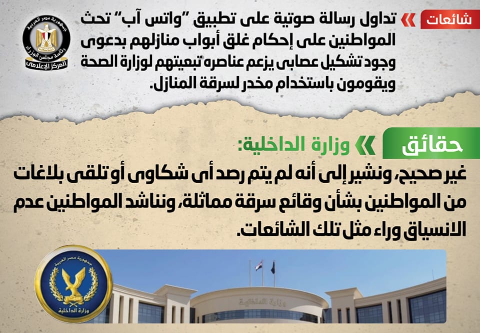 تواصل المركز الإعلامي لمجلس الوزراء بالتواصل مع وزارة الداخلية، والتي نفت تلك الأنباء، مُؤكدةً أنه لا صحة لتلك الرسالة الصوتية المتداولة التي تحث المواطنين على إحكام غلق أبواب منازلهم بدعوى وجود تشكيل عصابي يزعم عناصره تبعيتهم لوزارة الصحة ويقومون باستخدام مخدر لسرقة المنازل، مُشيرةً إلى أنه لم يتم رصد أي شكاوى أو تلقي بلاغات من المواطنين بشأن وقائع سرقة مماثلة، مُناشدةً المواطنين عدم الانسياق وراء مثل تلك الشائعات.