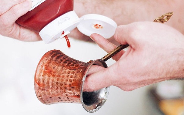 قومي ببل فوطة مصنوعة من القماش، بكمية صغيرة من الكاتشب، مع الاستمرار في فرك سطح الآنية النحاس.