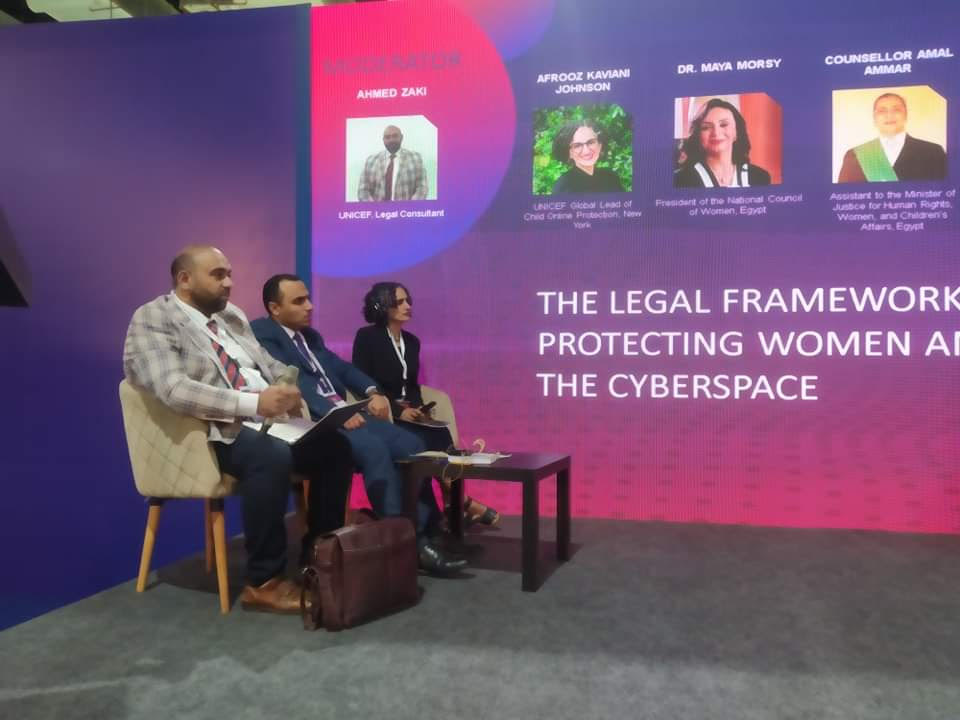 على هامش المؤتمر تم تنظيم جلسة نقاشية بعنوان (الإطار القانوني لحماية المرأة والطفل في الفضاء الإلكتروني)، جاء ذلك بحضور السيد المستشار علاء رمضان المستشار القانوني  للمجلس القومي للطفولة والأمومة، والسيدة/ أفروز كافاني جونسون- أستشاري حماية الأطفال من مخاطر الإنترنت – الممثل العالمي لمنظمة اليونيسيف نيويورك، والسيد المستشار محمد خلف مدير إدارة التعاون الدولي وحقوق الانسان بمكتب النائب العام، والسيد المستشار رفيق سالم العضو الفني بقطاع حقوق الإنسان والمرأة والطفل بوزارة العدل المصرية، والأستاذة / ولاء سليم مديرة المتابعة والتقييم بمكتب شكاوى المرأة بالمجلس القومي للمرأة، والأستاذ محمد فريد عضو مجلس الشيوخ وعضو تنسيقية شباب الأحزاب،  وأدار الجلسة السيد / أحمد زكي استشاري حماية الطفل بمنظمة يونيسيف.