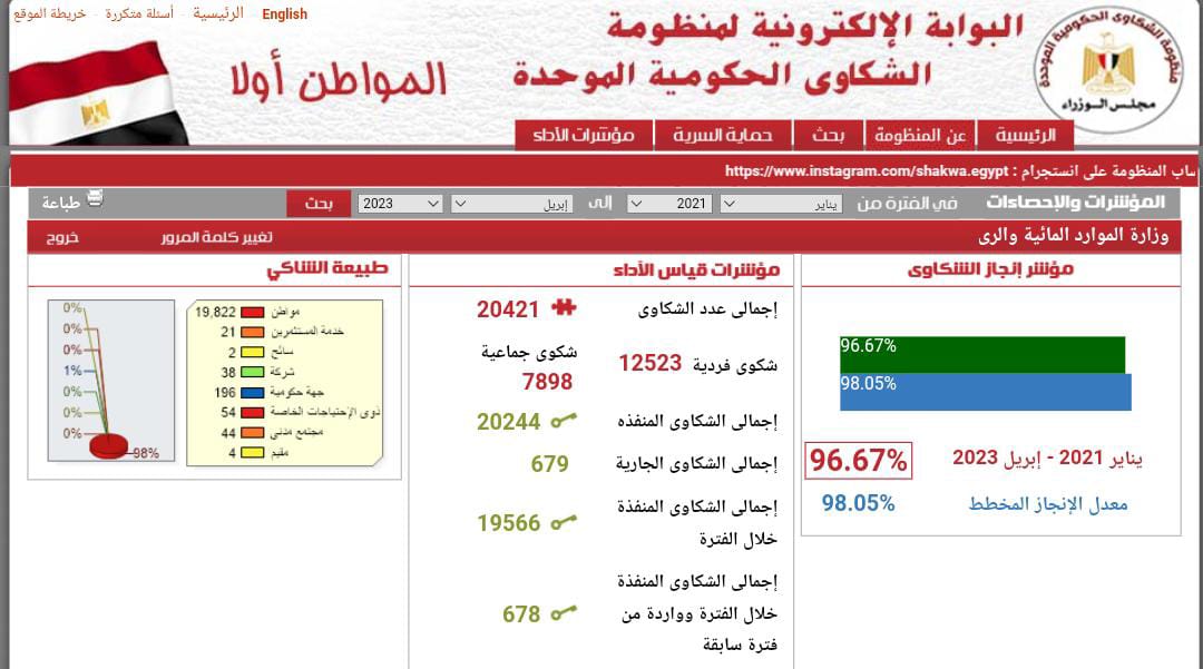 كما استعرض موقف منظومة الشكاوى الحكومية الموحدة بمجلس الوزراء والتي أوضحت أن نسبة تنفيذ الشكاوى خلال الفترة من يناير ٢٠٢١ حتى نهاية شهر ابريل ٢٠٢٣ بلغت (٩٦%) ، كما انتهت الوزارة من بحث ودراسة عدد (٢٥٠) شكوى وطلب واستغاثة خلال شهر أبريل ٢٠٢٣.