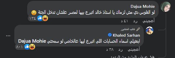 ولم يكن التشابه بين محمد رمضان وخالد سرحان فقط في هذا الموقف، إلا أن علقت إحدى متابعيه  على الصورة، تطالبه بان يقدم هذه الاموال ويتبرع بها للدولة، كاتبة: "لو الفلوس دي مش لزماك يا استاذ خالد اتبرع بيها لمصر علشان تدخل الجنة"، ليرد سرحان: "ابعتيلي اسماء الحسابات اللي اتبرع ليها عالخاص لو سمحتي".