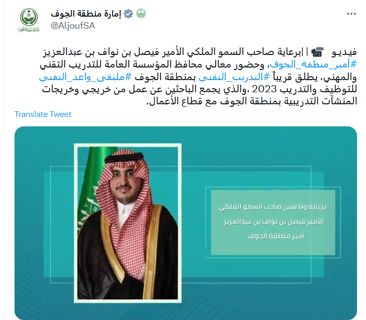 وقالت إمارة منطقة الجوف:"برعاية الأمير فيصل بن نواف بن عبدالعزيز أمير منطقة الجوف، وحضور محافظ المؤسسة العامة للتدريب التقني والمهني، يطلق قريباً التدريب التقني بمنطقة الجوف ملتقى واعد التقني للتوظيف والتدريب 2023، والذي يجمع الباحثين عن عمل من خريجي وخريجات المنشآت التدريبية بمنطقة الجوف مع قطاع الأعمال".