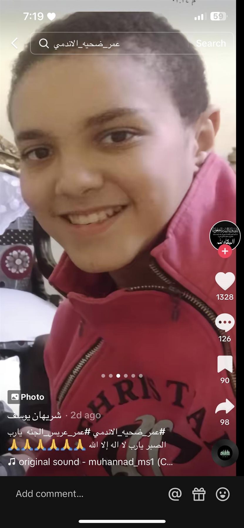 وكشفت الفتاة عن السبب الرئيسي لوفاته قائلة :" الحمد لله والله يسامحه ويرحمه.. عيل عنده 17 سنة بيحب الاندومي الكوري الحراق.. الشطة بتبوظ له الكلى وتفقع له المرارة.. 5 أيام وتوفي".