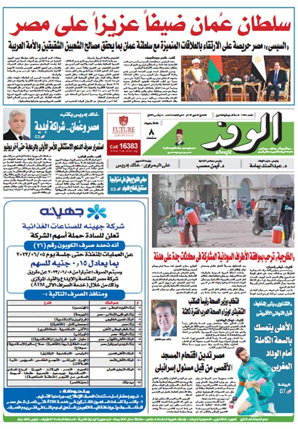 تنشر جريدة الوفد في عددها الصادر، غدًا الإثنين، العديد من الموضوعات والتقارير الإخبارية المهمة، أبرزها: "سلطان عمان ضيفا عزيزا على مصر".