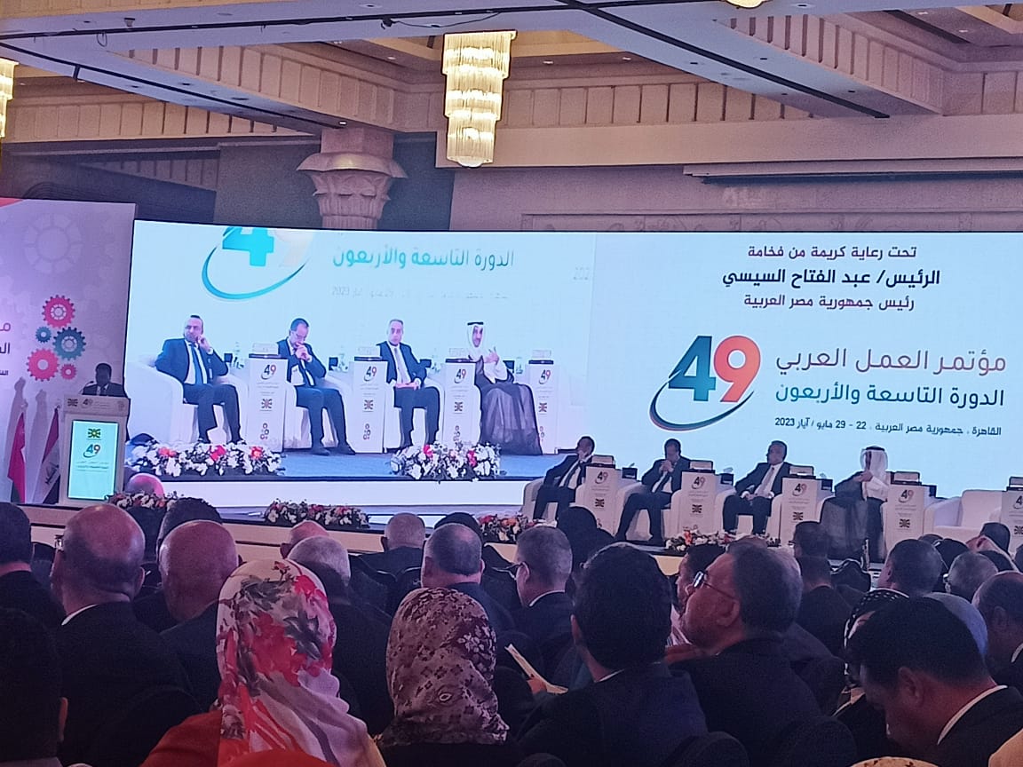 جاء ذلك خلال فعاليات الجلسة الأولى من مؤتمر العمل العربي في دورته الـ 49 وذلك بحضور 21 دولة ممثلين لأطراف العمل الثلاثة (حكومات - أصحاب أعمال - عمال) وذلك بأحد الفنادق الكبرى، تحت رعاية الرئيس عبد الفتاح السيسي رئيس الجمهورية.