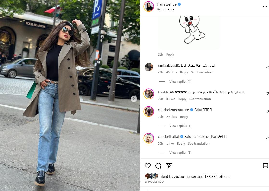 وتألقت هيفاء وهبي بإطلالة كاجوال ناعمة، مستعرضة رشاقة قوامها لتبدو وكأنها في عمر العشرين، حيث ارتدت بادي مجسم ونسقت عليه بنطال جينز ينتمي لصيحة الهاي ويست وعليه بالطو طويل صمم من الجوخ، فيما انتعلت حذاء مسطحا.