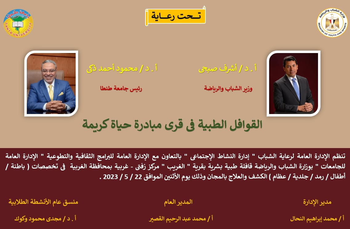 تواصل وزارة الشباب والرياضة - الإدارة المركزية لتنمية الشباب، الإدارة العامة للبرامج والأنشطة الجامعية، بالتعاون مع جامعة طنطا الإدارة العامة لرعاية الطلاب، تنفيذ القوافل الطبية التي تجوب محافظات الدلتا ضمن المبادرة الرئاسية "حياة كريمة"، إذ انطلقت القافلة الطبية الثانية بقرية "الغريب" بمركز زفتى بمحافظة الغربية.