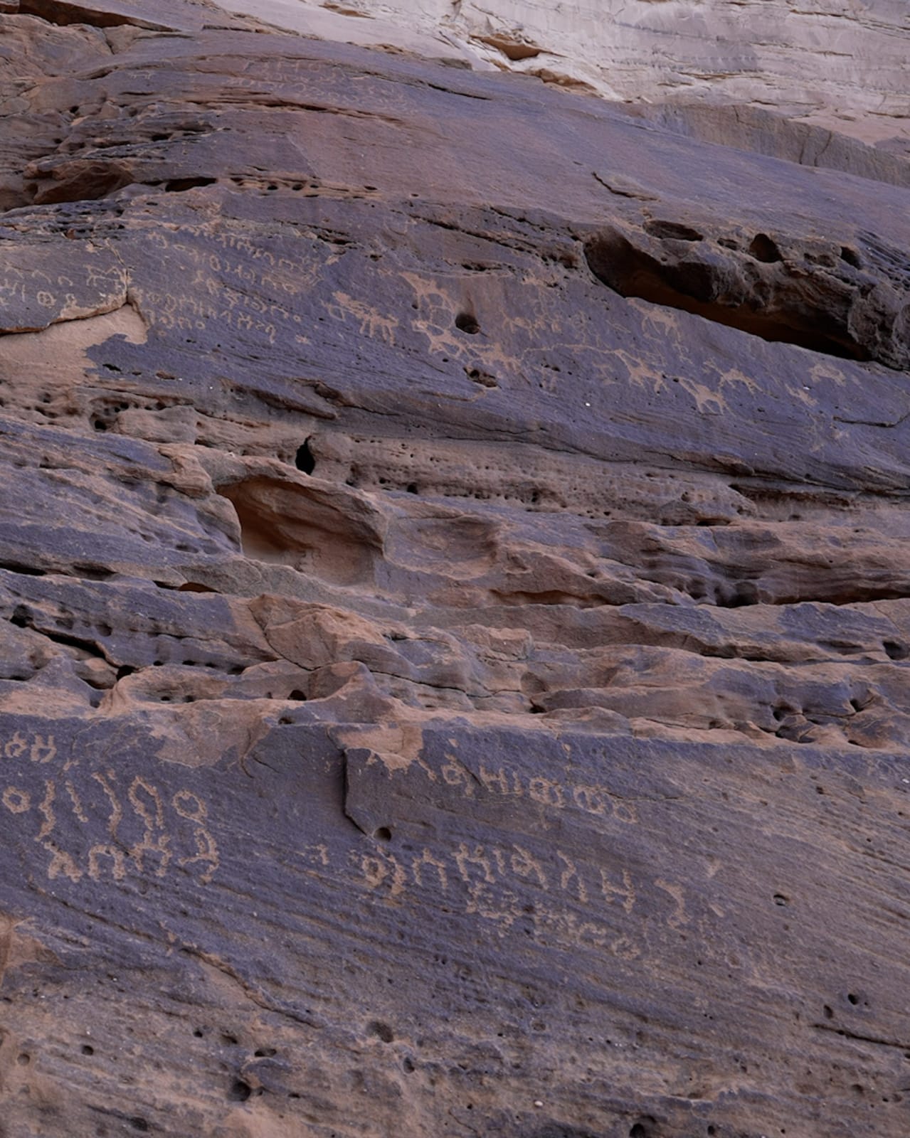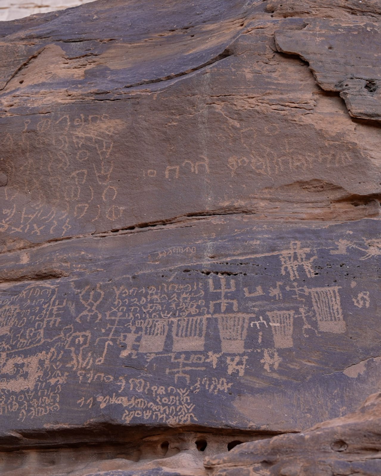 وتعود معظم نقوش الموقع، التي يتجاوز عددها الـ300 نقش، إلى النصف الثاني من الألفية الأولى قبل الميلاد؛ وتضم العديد من الرموز والنقوش التي تشير للكثير من الكلمات والطقوس الدينية والأنشطة والتعابير البشرية خلال حضارات عدة عاشت في العلا.
