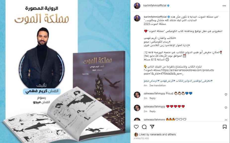 على صعيد آخر، احتفل كريم فهمي بصدور وتوقيع أول نسخ كتابه الذي يحمل عنوان "مملكة الموت" وينتمي لنوعية القصص المصورة، حيث شارك جمهوره بصورة من غلاف الكتاب عبر حسابه الشخصي بموقع تبادل الصور والفيديوهات "إنستجرام"، وهو عبارة عن رواية مصورة تضمن العديد من الاسكتشات المصورة والتي اشتهر بتقديمها عالمياً كما انتشرت بوقت من الأوقات بفترة التسعينات ومنها القصص المصورة التي تحاكي قصص الأنبياء بأسلوب مختلف ويتشابه مع القصص المصورة الأمريكية الشهيرة مثل "مارفل".
