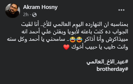 احتفل الفنان أكرم حسني بيوم الأخ العالمي على طريقته الخاصة، وحرص على استعادة ذكريات طفولته مع شقيقه، من خلال منشور كوميدي عبر حسابه الشخصي بموقع التواصل الإجتماعي الأشهر "فيس بوك".
