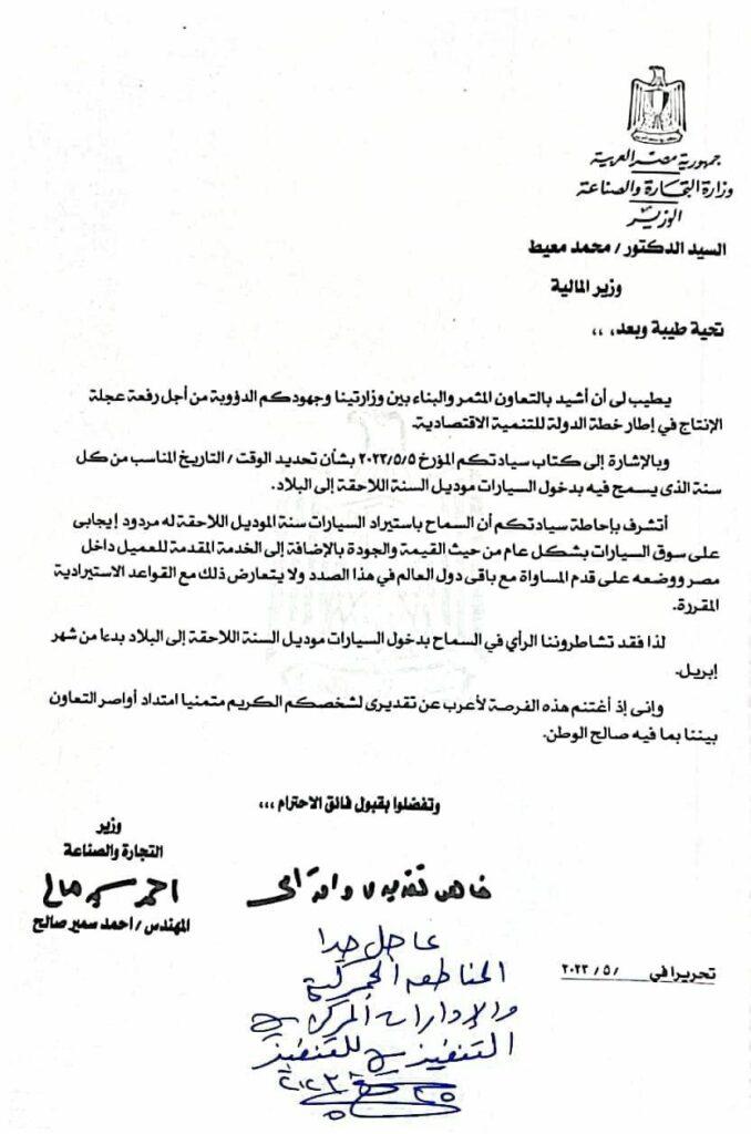 خطاب من التجارة والصناعة إلى المالية بالسماح باستيراد السيارات موديل السنة اللاحقة