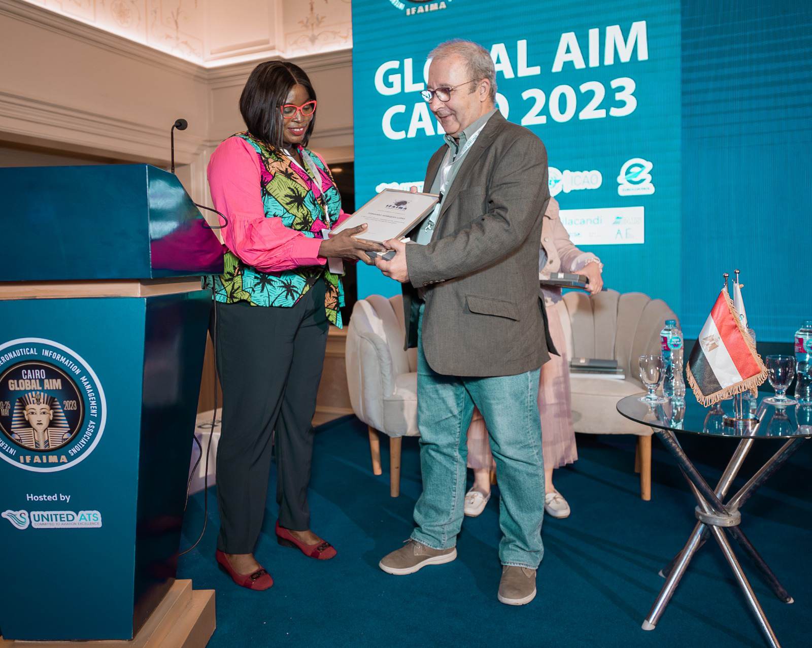 وتقدم رئيس الشركة المتحدة UNITED ATS بالشكر، للسيد/ Fernando Lopes رئيس الاتحاد الدولي لضباط معلومات الطيران السابق (IFAIMA) على الجهود التي بذلها لسنوات من أجل خدمة أعضاء الاتحاد العالمي لمعلومات الطيران، متمنيا له التوفيق بعد تسليمه رئاسة الاتحاد للسيدة/ “Funmi Adeyemi”، الذي تمنى لها التوفيق في استكمال المهمة مع مجتمع معلومات الطيران الدولي AIM.