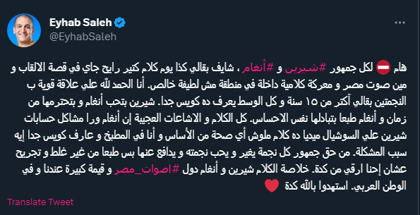 علق إيهاب صالح عن الأخبار المتداولة، وذلك خلال تويتة عبر حسابه الرسمي على موقع تويتر قائلًا : "مهم لكل جمهور شيرين وأنغام، شايف بقالي كذا يوم كلام كتير رايح جاي في قصة الألقاب  مين صوت مصر و معركة كلامية داخلة في منطقة مش لطيفة خالص".
