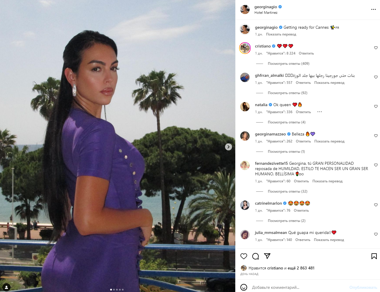 ونشرت جورجينا رودريغيز، عبر حسابها على موقع "إنستجرام" صورة لها من فندق مارتينيز بمدينة كان الفرنسية، بزي جريء حيث كانت ترتدي فستانًا قصيرًا أرجوانيًا، وعلقت عليها: "الاستعداد إلى مهرجان كان".