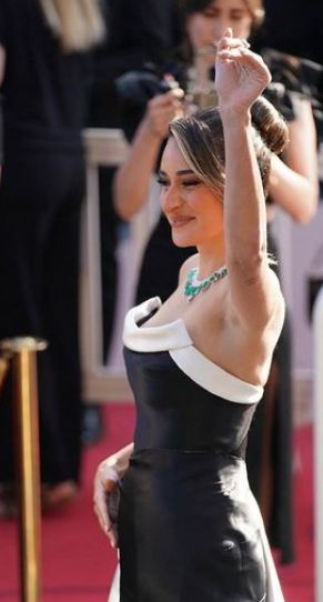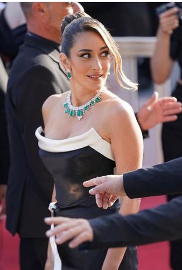 وتزينت بطقم صمم من حبات الألماس مع حجر الزمرد الساحر لتكمل فخامة إطلالتها.