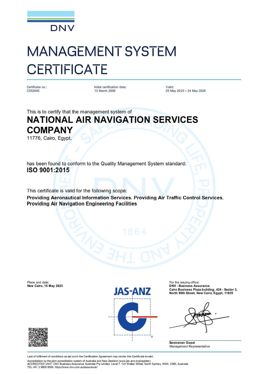 نجحت الشركة الوطنية لخدمات الملاحة الجوية فى تجديد اعتماد شهادة الأيزو (ISO-9001-2015) من الشركة العالمية المانحة (DNV) وذلك للعام الثانى على التوالى ولمدة ثلاث سنوات بعد ان اجتازت الشركة جميع المراجعات والتدقيقات الخاصه بتطبيق كافة الإجراءات ومتطلبات الجودة القياسية طبقا للمواصفات الدولية.