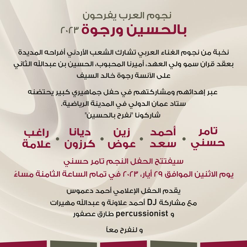 كرنفال غنائي بمناسبة زفاف ولي العهد الأردني.. الليلة