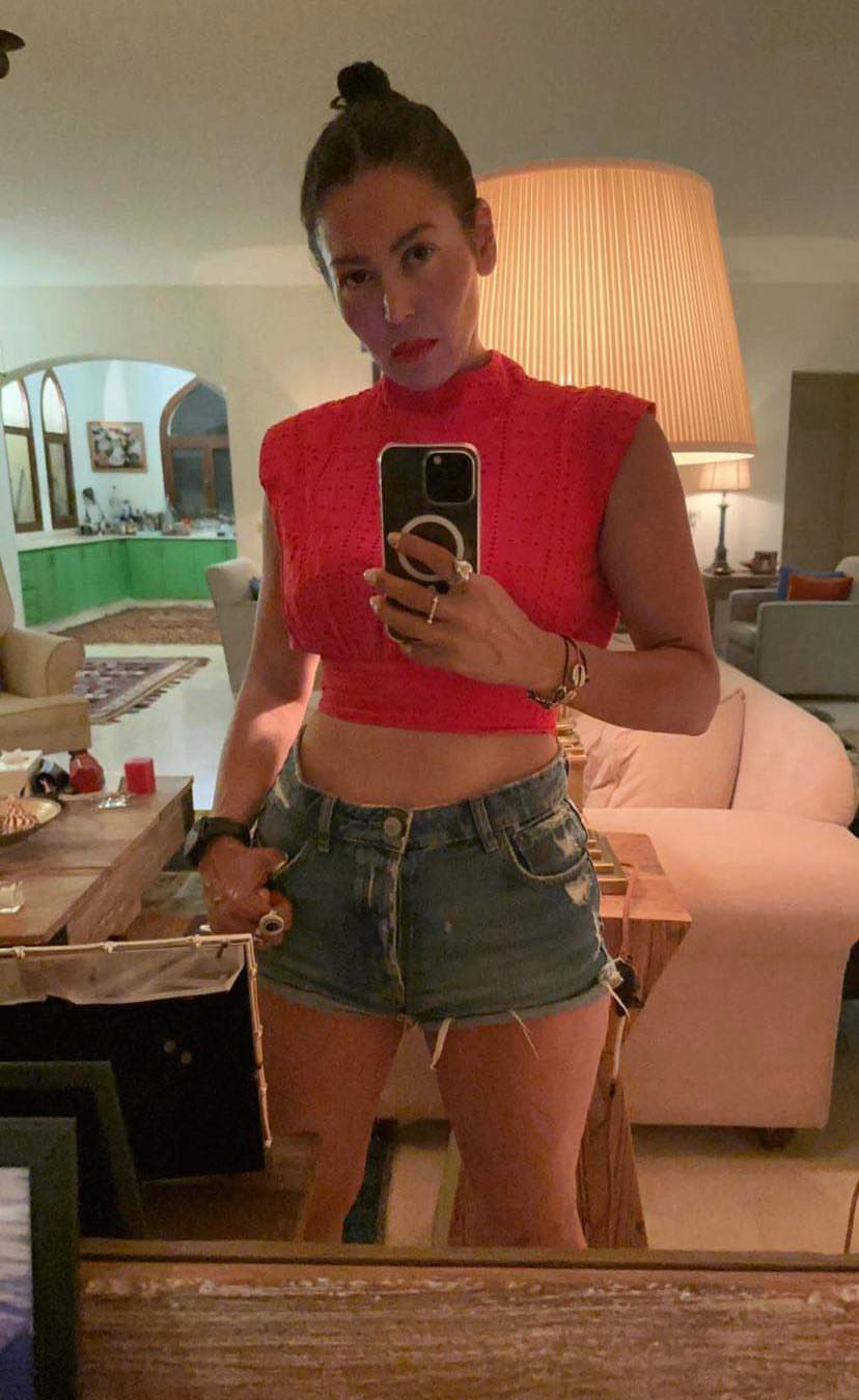 وتألقت لقاء الخميسي بإطلالة مثيرة وجذابة، إذ ارتدت توب قصير باللون الأحمر مكشوف البطن والأكمام، فيما نسقت عليه هوت شورت جينز ممزق باللون الأزرق الداكن، مما أبرز أنوثتها وقوامها الرشيق الممشوق.