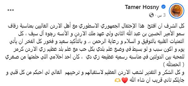 أعرب تامر حسني عن مدى سعادته بإحياء حفل عقد قران الأمير الحسين بن عبد الله الثاني، ولي العهد، مساء أمس الإثنين، وذلك عبر حسابه الرسمي بموقع التواصل الاجتماعي "فيسبوك".